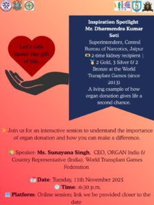 There was also a special guest invited by ORGAN India. Mr. Dharmendra Kumar Soti, Superintendent at the Central Bureau of Narcotics, Jaipur, and a two-time kidney transplant recipient shared his extraordinary story. His journey from patient to champion is nothing short of inspirational, having won 2 Gold, 3 Silver, and 2 Bronze medals at the World Transplant Games since 2013, he stands as a living testament to the power of organ donation.