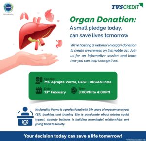 ORGAN India collaborated with TVS Credit to advance awareness around organ donation and highlight how this selfless act can save and transform lives. As part of this initiative, a webinar was conducted and attended by over 75 employees from various TVS Credit offices across the country. We sincerely appreciate TVS Credit for partnering with us and supporting this noble cause.